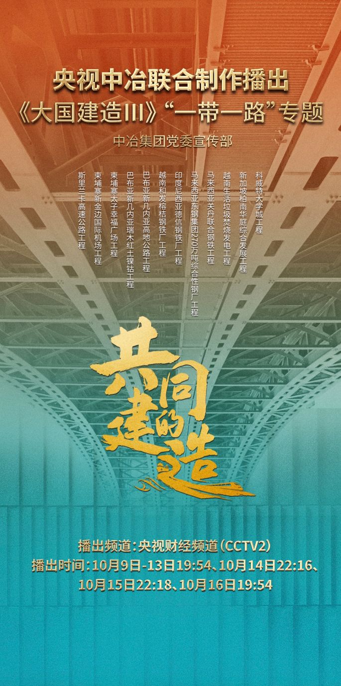 2023年是共建“一带一路”倡议提出十周年,中冶集团与中央广播电视总台联合打造献礼“一带一路”十周年重点节目《大国建造Ⅲ》“一带一路”专题片《共同的建造》将于10月9日-16日在央视财经频道(CCTV2)黄金档隆重播出。经中冶集团党委宣传部积极宣推策划,中冶集团12个海外重大项目与中国建筑、中国铁建、中国交建项目共同成为建筑央企“大国建造”走出去的品牌代表。作为献礼“一带一路”十周年重点节目,该节目将展现中国建设者跨越山海,与“一带一路”共建国家人民共商共建共享、将蓝图变实景的动人故事。