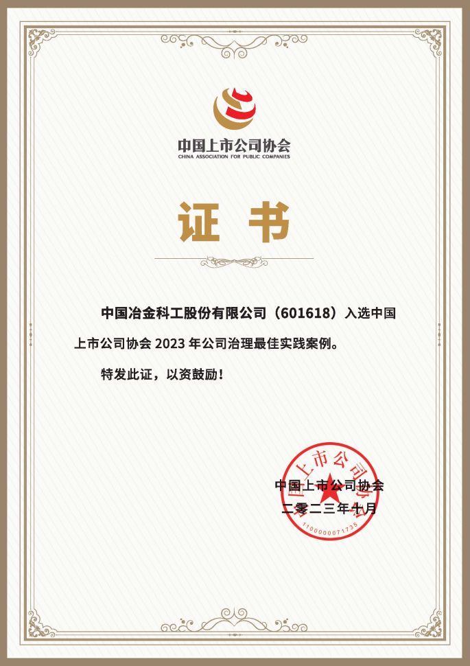 中冶董事会办公室最新消息:近日,在中国上市公司协会举办的公司治理最佳实践案例创建活动中,中国中冶从5000余家A股上市公司中脱颖而出,成功入选“中国上市公司协会2023年公司治理最佳实践案例”,并被收录至《中国上市公司治理报告》,欣闻此喜讯,5845cc威尼人机电表示热烈祝贺。
