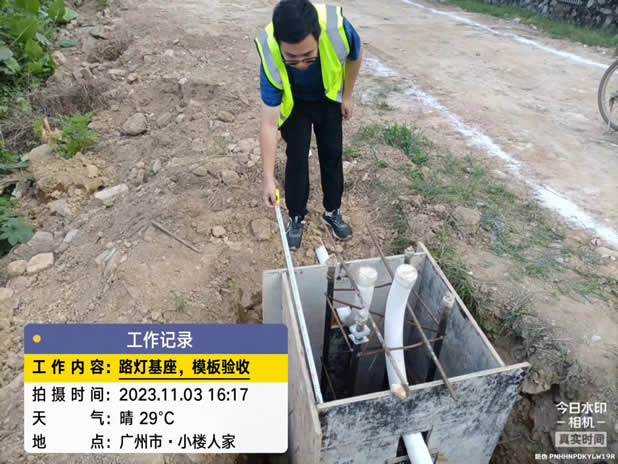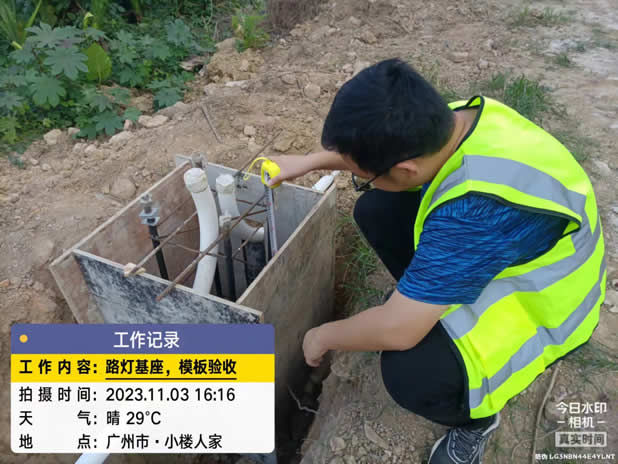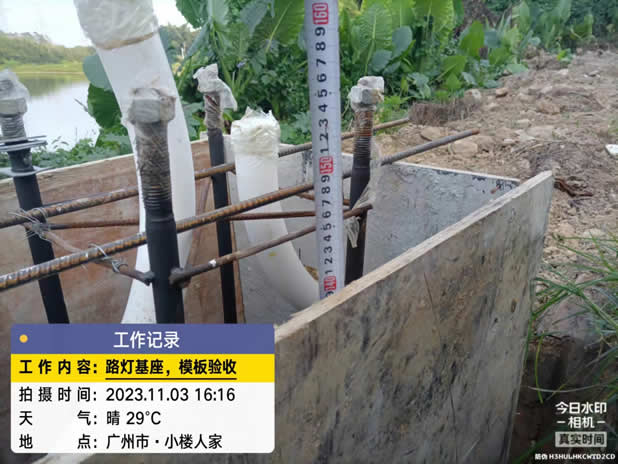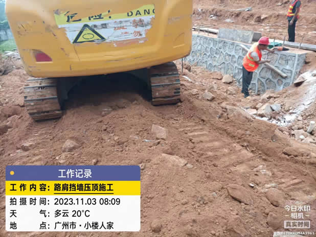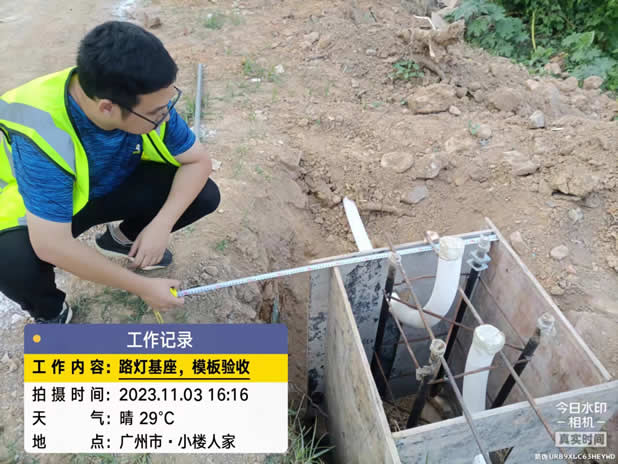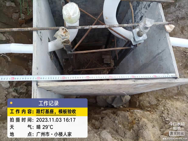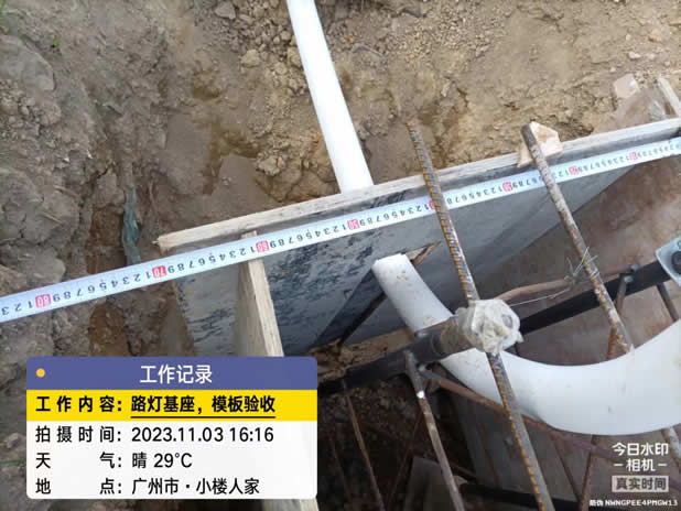 工程图例:广州市保利小楼大院路肩挡墙压顶施工-路灯基座模板验收施工人员:3名工人+1名现场管理人员,挖机1台,压路车1台,土方车1台施工单位:5845cc威尼人(股份)有限公司-官方网站施工时间:2023年11月3日