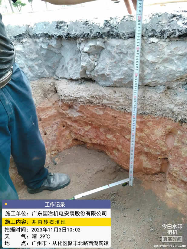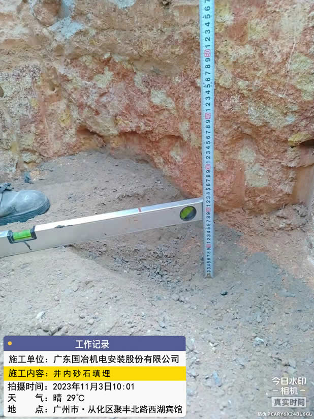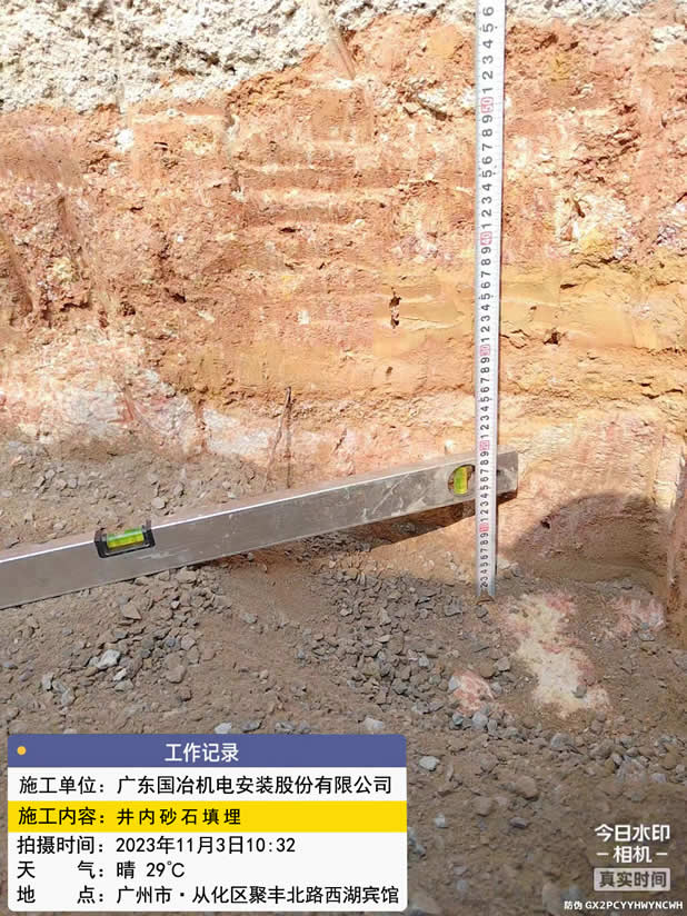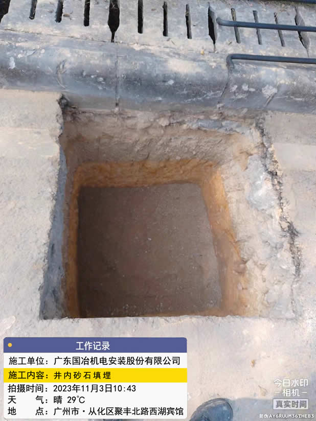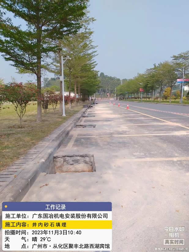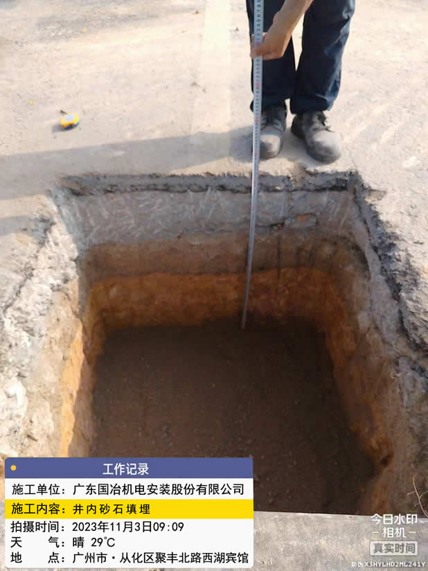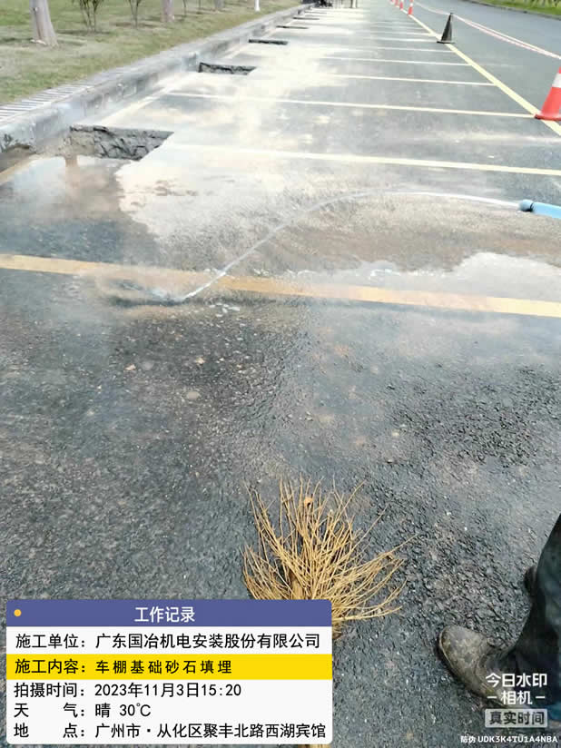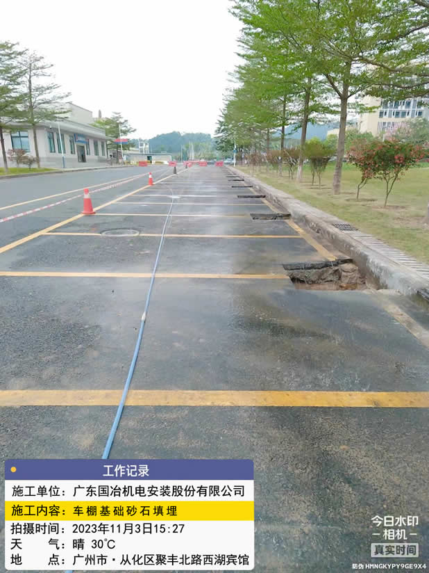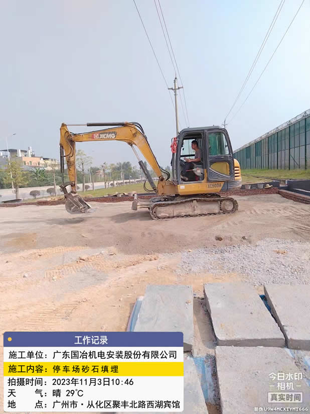 工程图例:广州市从化区聚丰北路西湖宾馆停车场车棚基础砂石填埋施工人员:6名工人+1名现场管理人员,挖机1台,压路车1台,土方车1台施工单位:5845cc威尼人(股份)有限公司-官方网站施工时间:2023年11月3日