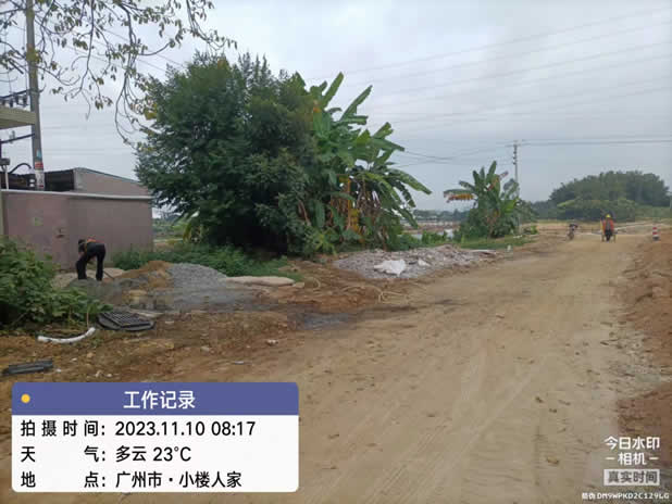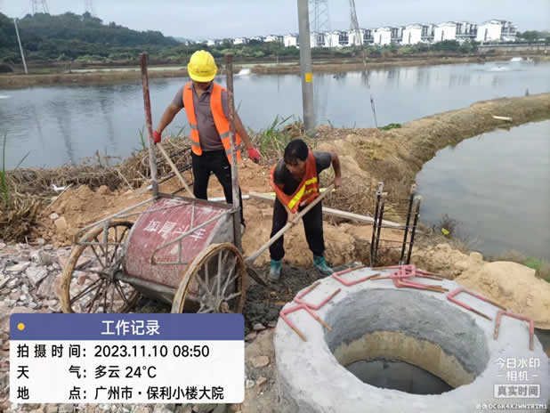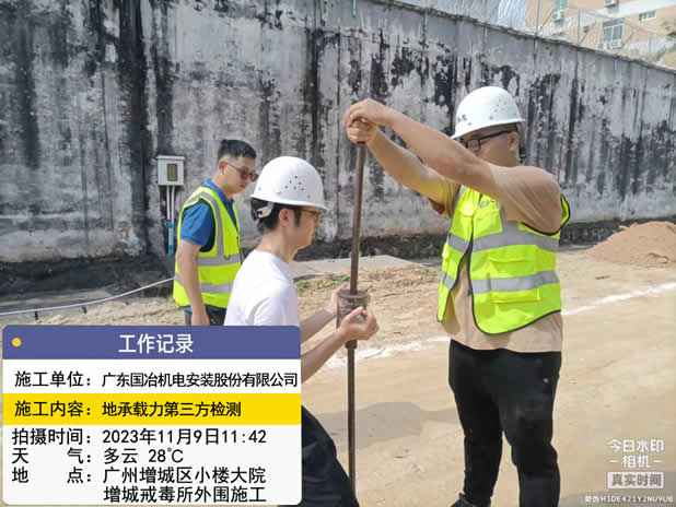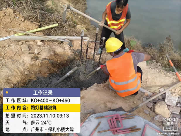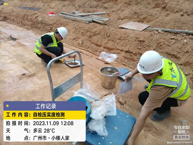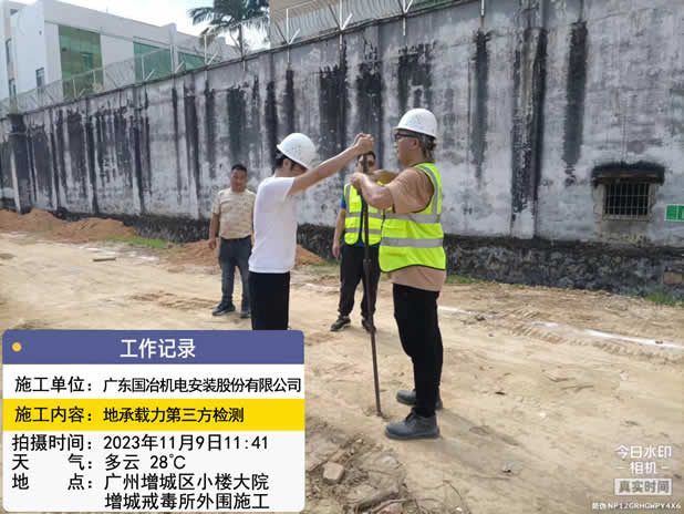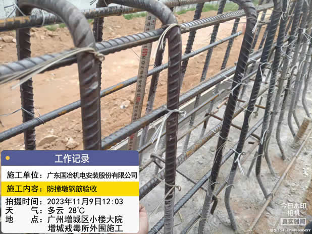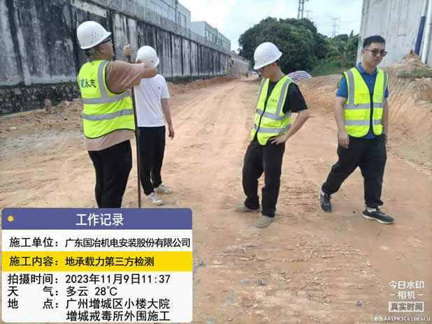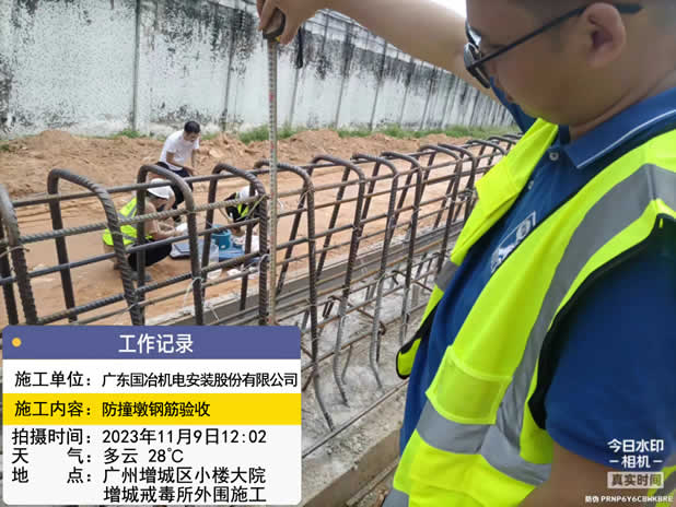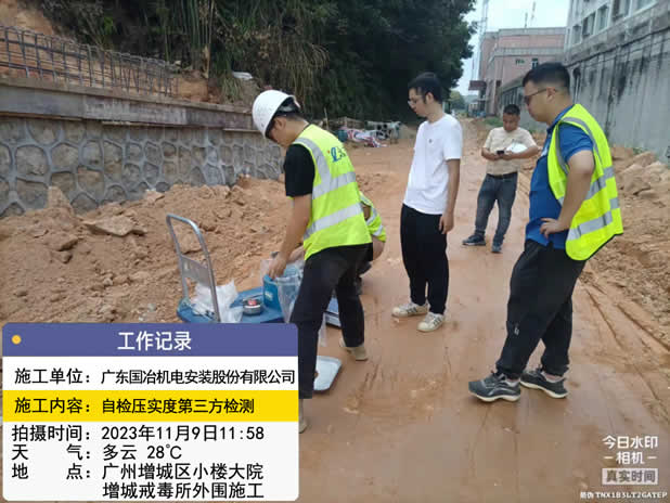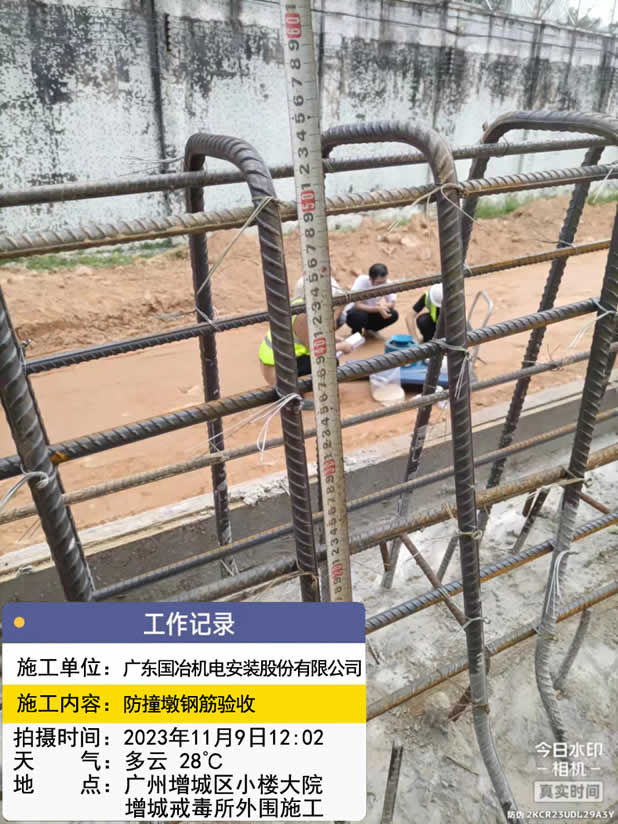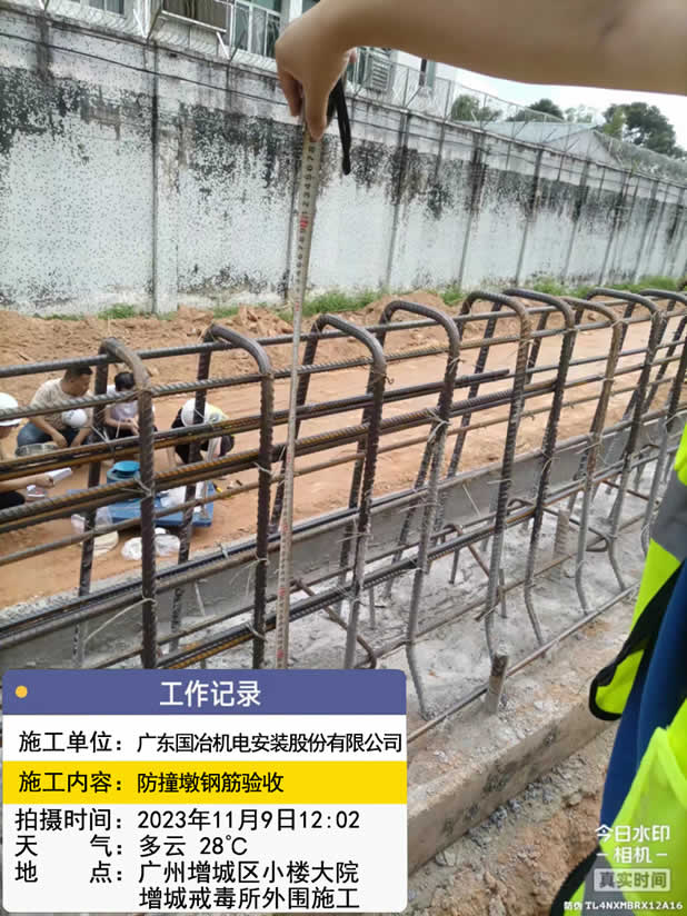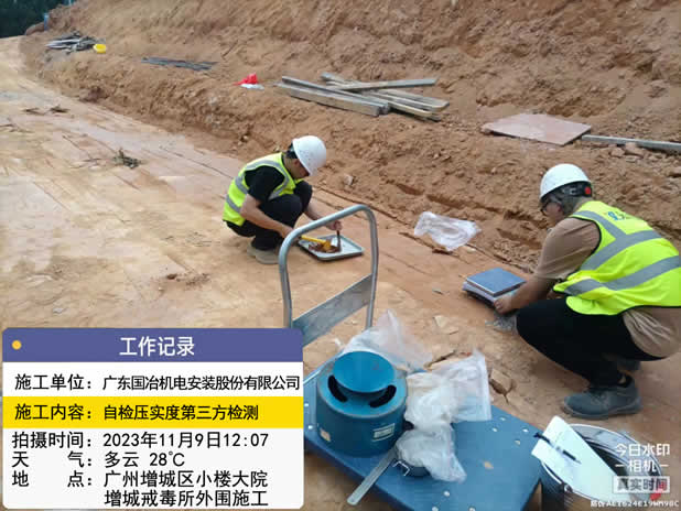 工程图例:广州市保利小楼大院增城戒毒所外围防撞墩钢筋验收,地承载力自检压实度第三方检测,路灯基础浇筑施工人员:5名工人+1名现场管理人员,挖机1台,压路车1台,土方车1台施工单位:5845cc威尼人(股份)有限公司-官方网站施工时间:2023年11月9日至10日